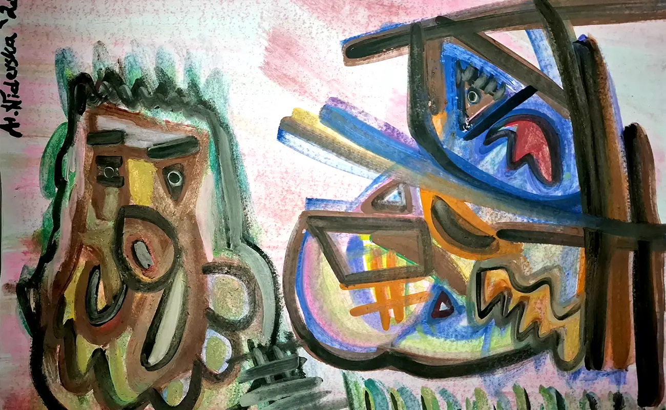 At the core of Agnieszka Widerska’s practice lies a sustained fascination with human stories and the emotional weight they carry. Although her work is firmly rooted in abstraction, it consistently points back to lived experience. Faces, figures, and symbolic forms often appear without being fully defined, suggesting people rather than portraying them directly. This approach allows her to address universal themes such as loss, celebration, conflict, and connection without anchoring them to specific identities. Ordinary individuals, fleeting encounters, and shared social moments become catalysts for visual exploration, transformed into color, line, and rhythm.