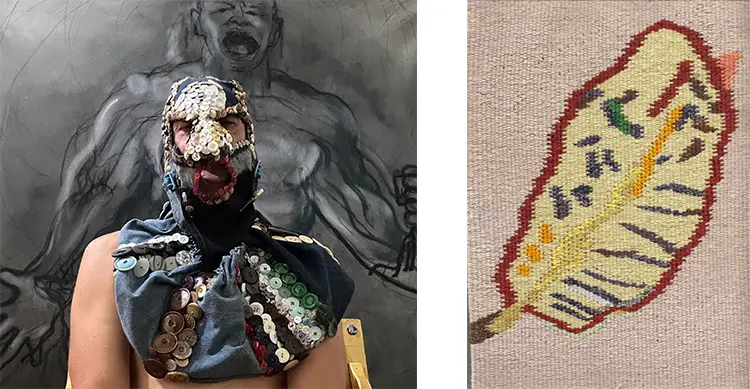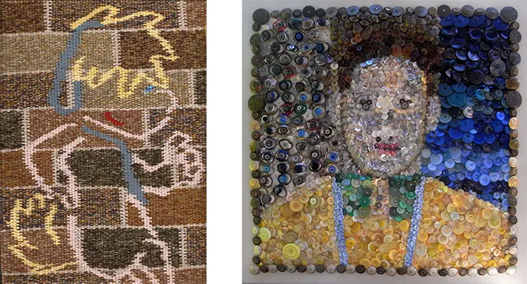 Over time, his use of materials has evolved in tandem with his conceptual interests. While trained as a tapestry artist, Veenstra has never confined himself to traditional textile media. His explorations have included button collages, macramé, and patchwork—each acting as a site of experimentation and storytelling. Notably, he completed a portrait of a couple engaged to be married using only buttons. The work not only achieved a striking visual likeness but played with the ephemerality of surface and memory, inviting contemplation on material impermanence and the fleeting nature of human moments.