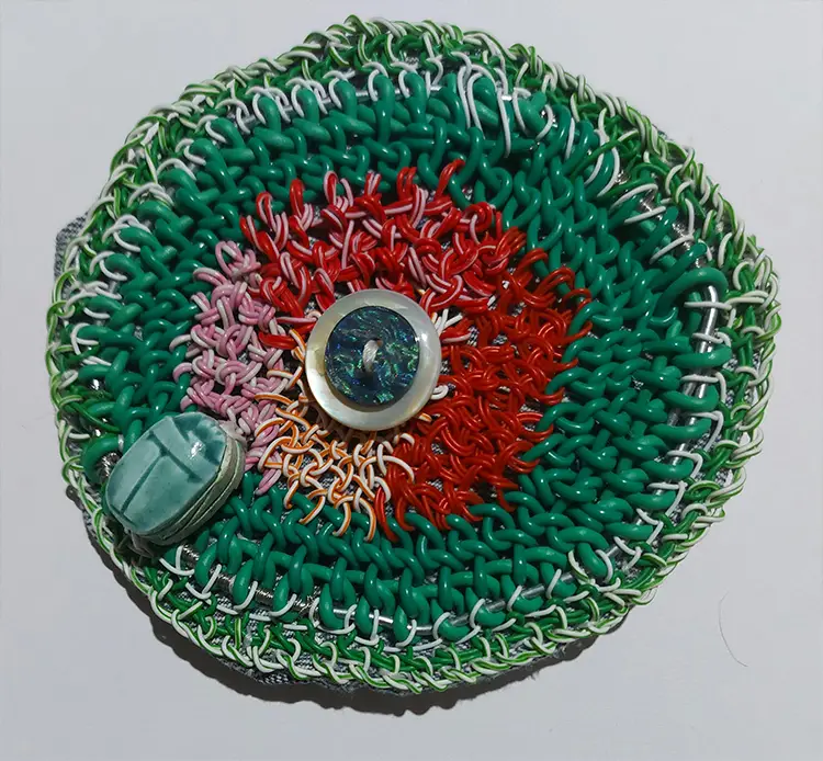 Recently, Veenstra has turned to the miniature scale of wearable art, most notably brooches. Working autonomously, he incorporates shaped wire, electrical cable, and multi-colored data cords into these intricate pieces. In them, he transforms utilitarian materials into layered visual statements. His use of the double half hitch—once merely functional in tapestry—now becomes an aesthetic gesture. Here, references to Bridget Riley’s optical dynamism surface subtly through color and pattern play, where wires and buttons weave into vivid visual fields that pulse with rhythm and form.