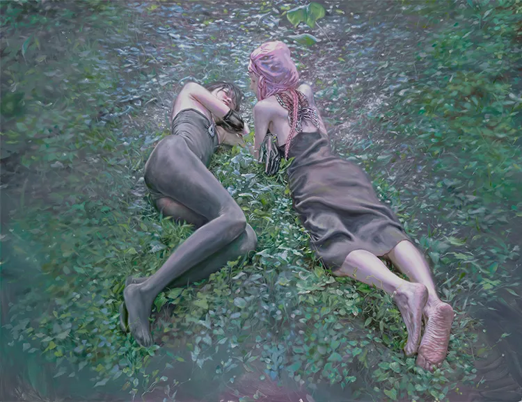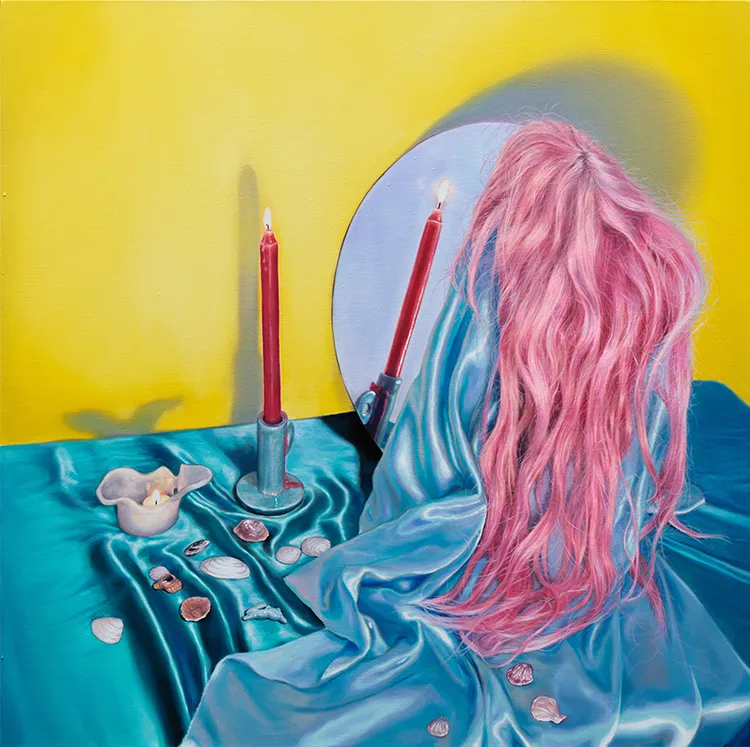 Ayuna’s work weaves together personal mythology and nature, reflecting a deeply interconnected relationship between the two. She sees herself as a storyteller, with each painting an episode in the life of a persona inspired by the natural world. These personas, such as the pink-haired ‘Shell,’ emerge from her exploration of the natural elements and their connection to the human experience. Shell, for example, is not just a character but a representation of love, regeneration, and abundance—concepts central to Ayuna’s artistic vision. Through her personas, Ayuna celebrates the life-affirming power of nature, inviting viewers into a universe where life is continuously renewed.