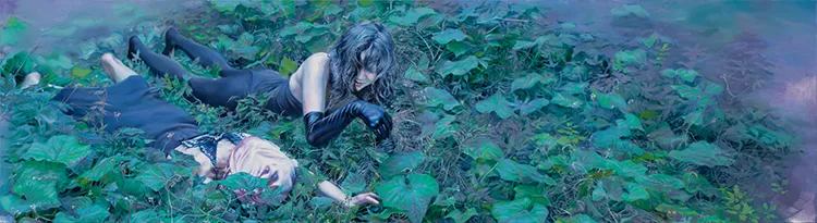 Ayuna’s creative process is guided by the natural world’s rhythms, especially the cycles of the moon, which play a significant role in her work. She studies the ebb and flow of the moon’s phases, finding inspiration in its mysterious influence over nature. Her canvases often become stages for her personas to interact with these lunar forces, capturing the essence of life’s cyclical nature. This connection to the moon imbues her work with a sense of timelessness, reflecting the idea that nature’s patterns are eternal, much like the themes of love and hope she explores in her art.
