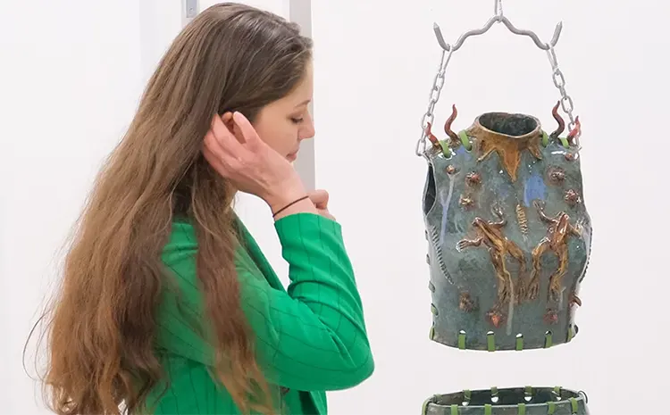 Beyond the world of contemporary art, Becky finds inspiration in the realms of arms and armour, medieval art, and even pop culture. Her frequent visits to Leeds Armoury during her childhood imbued her with a fascination for ornate metal shells, a fascination that is palpably reflected in her work. The influence of motorbikes and the ritual of donning leather armour, along with her childhood obsession with Power Rangers, underscores the impact of costume and armour on her artistic style. Additionally, the rich tapestry of medieval art, with its bestiaries and marginal drolleries, feeds into the anachronistic nature of her work. Becky’s diverse range of influences, from fashion and film to literature, ensures that her work remains fresh, dynamic, and continuously evolving.