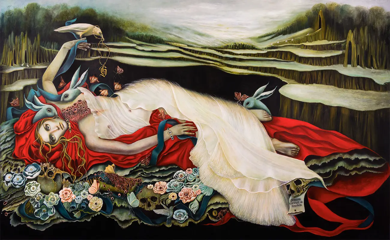 Rooted in an emotionally charged visual language, her practice stems from a deep well of personal heritage and spiritual exploration. Gpollieana’s Italian lineage, with its evocative Renaissance undertones and symbology, serves as both compass and canvas. The interplay between tradition and rebellion, beauty and grief, informs her artistic ethos, forming the psychological and emotional architecture of her practice. In her work, dualities coexist: the sacred and profane, the ornamental and the raw. Each piece is conceived as a visual poem—layered with meaning, shaped by intuition, and charged with symbolic energy.