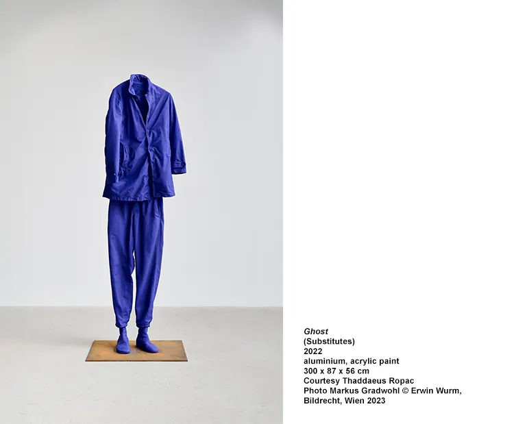 In Erwin Wurm’s recent artistic endeavors, Ghost (Substitutes) emerges as a testament to his sculptural vision. In this piece, Wurm transforms ordinary clothing into an extraordinary sculpture, setting the stage for a contemplation of the material and the immaterial. This artwork is not just a physical transformation but a conceptual leap, elevating mundane attire to the realm of fine art. By doing so, Wurm invites viewers to rethink their perceptions of everyday objects. The use of aluminium, starkly contrasting with the inherent softness of clothing, deepens the thematic intricacy of the piece. This juxtaposition is further enhanced by the application of acrylic paint, which imparts a fabric-like appearance to the metal, challenging our traditional perceptions of texture and material.