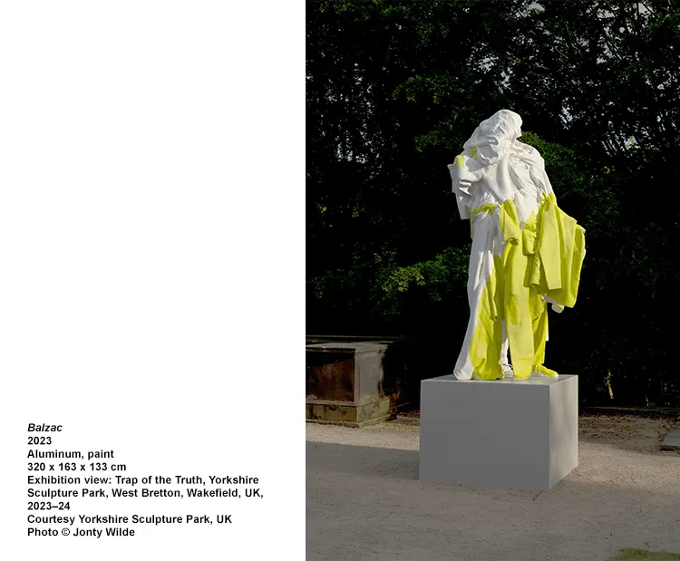 The unveiling of Wurm’s 3.2-metre-tall bronze sculpture of Balzac in 2023 presents a compelling counterpoint to Ghost (Substitutes). This grand sculpture, featuring the human form draped in intricate robes, echoes the splendor of ancient classical statuary. It not only represents a historical figure but also stands as a tribute to the enduring art of sculpture, blending classical and historical references with finesse. This piece pays homage to Rodin’s interpretation of Balzac, forging a link between the classical past and the present, and between different artistic approaches. The contrast between Wurm’s conceptual Ghost (Substitutes) and the traditional grandeur of Balzac exemplifies the artist’s range, skillfully navigating between contemporary art’s conceptual challenges and the deep-rooted traditions of classical sculpture.