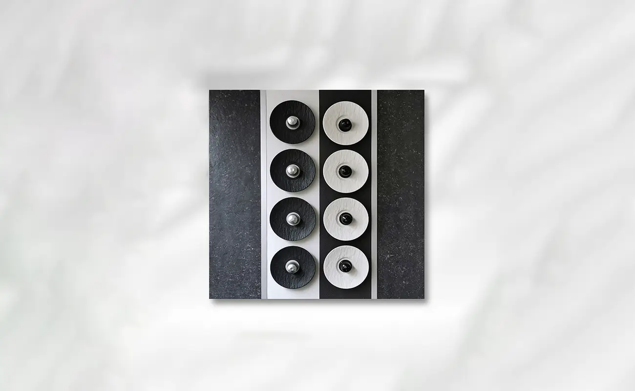 The materials selected for each work are anything but random. Kienzle creates his artworks using used coffee capsules, mounted on rectangular tiles made of marble, slate, porcelain stoneware, wood, or aluminium composite. Arranged in harmonious, modern series, each piece offers both structural elegance and visual weight. These core elements are enhanced with accents of leather, porcelain, ceramic, or stainless steel.