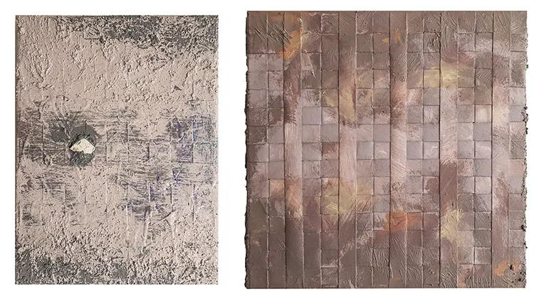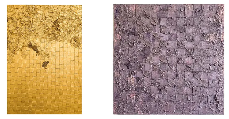 “Site Specific Memories (gold),” a significant piece in Lee’s oeuvre, embodies her deep connection to the histories she explores. Created with debris from the “All of Mankind” mural site, this work blends physical remnants with acrylic paint to craft a textured, abstract representation of memory and space. By incorporating traditional Korean weaving techniques, such as those used in ramie and jogakbo, Lee challenges conventional Western painting methods and highlights the cultural and gendered dimensions of craftsmanship.