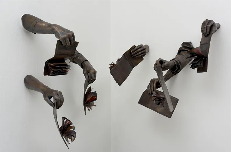 Die Dompas Moet Brand! (The Passbook Must Burn!), 2014. 7 life-cast arms holding passbooks; bronze and copper shim.