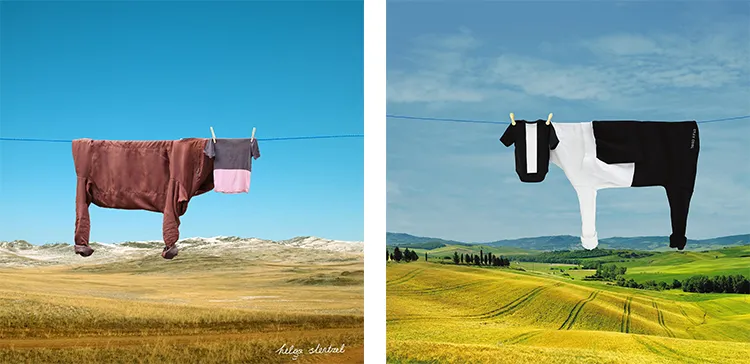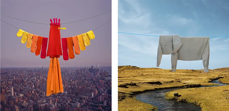 Helga Stentzel has made a name for herself through what she describes as “Household Surrealism,” a genre she has helped pioneer. This creative vision is perfectly exemplified by her viral “Clothing Line Animals” series, which turns clothes hanging on a washing line into charming, lifelike animals. The spark for this unique series came from a moment of observation during a simple task—laundry. Helga noticed that a sock draped on the floor looked like a horse’s head, and from that point, a new artistic series was born. In these creations, sweaters, socks, and trousers become polar bears, cows, and even a “Laundrosaurus,” capturing the imagination of her audience.