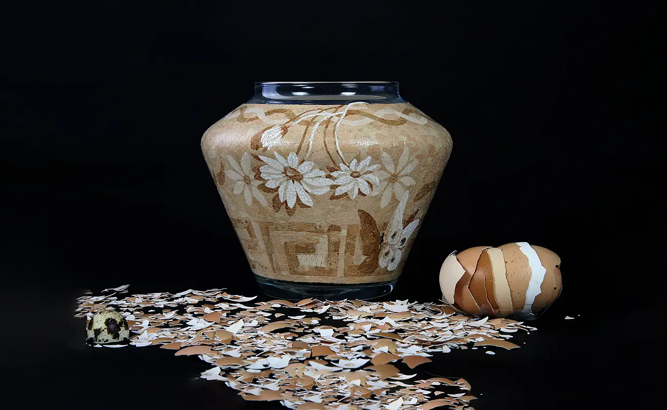 Mosaics have existed for millennia, yet Iravazi’s interpretation is startlingly original. Her technique, developed independently through trial and patience, employs bird eggshells as the sole material for patterns applied to transparent glass. Each vase becomes a sacred object, imbued with the quiet dignity of both nature and endurance. Her discovery of eggshell durability — heat- and moisture-resistant, lightfast, and resilient — aligned with a deepening connection to nature and the cosmos. These properties not only fascinated her, but validated her intuitive experiments. Even Aristotle, as she points out, once wrote extensively about eggshells, recognizing their structural wonder. Through passion and perseverance, Irina reemerged as an artist, not by formal training, but by necessity and inspiration.