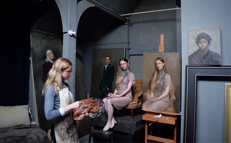 Though rooted in the traditions of the Old Masters, Isabella Watling continuously pushes her work in new directions. Her studio, a space filled with controlled natural light, is designed to allow her maximum flexibility in her practice. The high north-facing windows, walls painted a neutral grey to minimize reflections, and a pulley system to control the amount of light create an ideal environment for her meticulous process. Despite the technical precision required for her work, she often improvises, drawing inspiration from the way light changes or how a subject subtly shifts during the session.