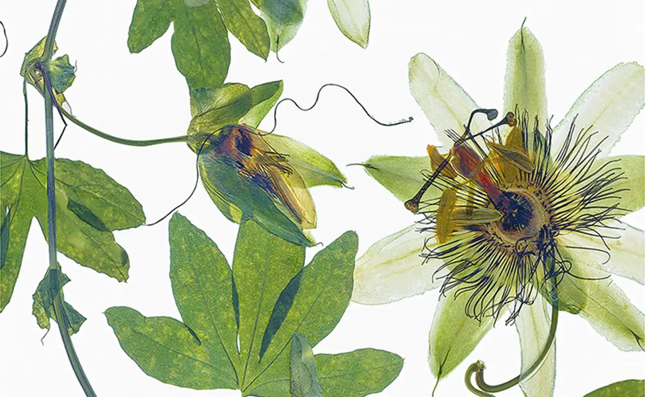 Today, Jane’s daily practice unfolds in London, where travel has slowed but attention remains focused. A small cedarwood greenhouse provides material throughout the year, from the vigorous Ipomoea indica producing fresh blue blooms each morning to Iris pseudacorus flowering beside a small pond. Specimens are pressed for varying lengths of time in a wooden book-binding press, sometimes after slicing or deconstructing buds to reveal interior detail. Plants such as Paphiopedilum and Passiflora caerulea may remain in the press for months before being photographed, while others dry within days. All images are printed at home, and the next ambition is a book titled The Interior World of Wildflowers, presenting more than eighty designs that continue this sustained conversation with nature.