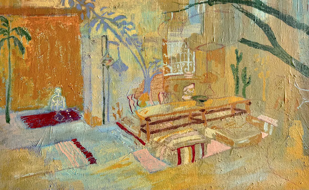 Jasper’s visual language captures fleeting, often poetic moments: sunlight casting warm patterns on tiled floors, the quiet silhouette of a palm tree at dusk, or the intimate glow of an interior lit by natural light. These moments are not incidental. They function as emotional anchors in his work, distilling larger experiences into sensory impressions that linger. By capturing these details, he invites viewers to linger within each scene, offering a space where personal reflection and imagination can unfold. His paintings are not about nostalgia, but about the emotional texture of memory, filtered through time and transformed into something new.
