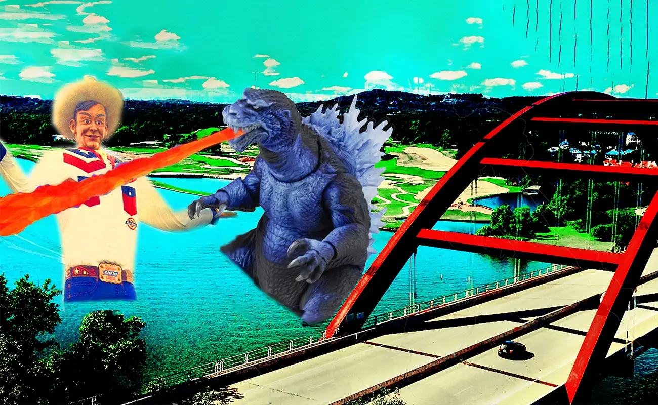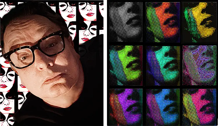 This trance-like working state appears repeatedly throughout Brown’s process. Robot Assassin emerged from a moment of chance observation at Emo’s, a frequented Austin night spot where he noticed a young friend leaning against the back wall. She began striking exaggerated poses, mimicking the confidence of a Charlie’s Angels character while brandishing finger guns. While refining the image later, Brown attempted to remove an unwanted background element and discovered an unexpected visual effect created by the erasing process across her legs. That accidental discovery redirected the entire composition, pulling him into a prolonged period of experimentation and refinement. A similar sense of irreproducible discovery defines Roy’s Gun. The photograph began as a straightforward request for an image of a woman holding a pistol at a bar. After delivering that version, Brown revisited the image in a heightened state of concentration, transforming it into a graphic homage to Roy Lichtenstein using offset-style dots and bold visual rhythm. Because he doesn’t keep a log of the steps he takes to create a new image, he admits it would be impossible for him to recreate another piece with the same look and style.