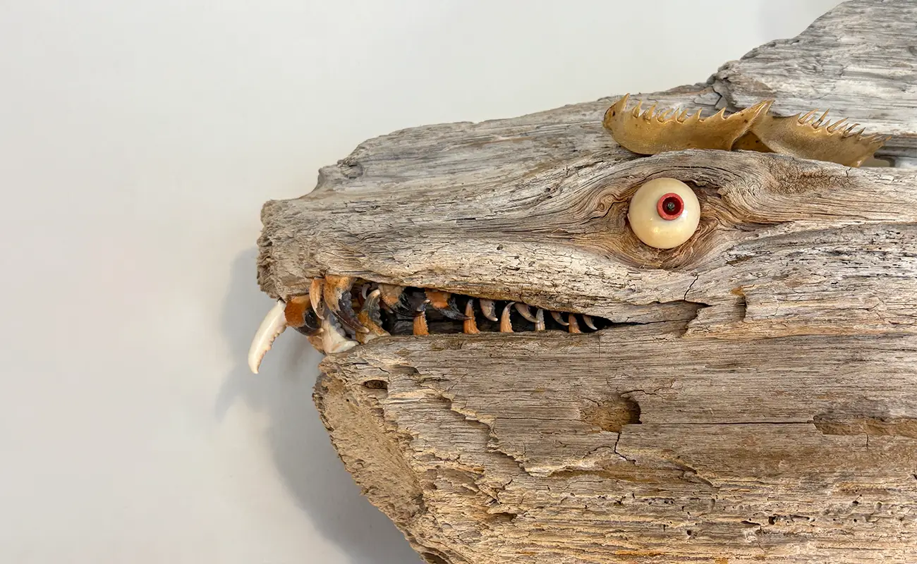 The practice soon expanded beyond sea glass to include a wide range of shoreline materials, including driftwood, shells, fibers, and marine remnants. Some materials used include unmodified driftwood, salt marsh hay, crab parts, oyster shells, periwinkles, lobster parts, fishing gear, beach sand, and fish bones. Through assemblage, De Haan began forming abstract sea creatures that felt both invented and discovered. The process unfolded intuitively, guided by experimentation rather than formal instruction. Each new material introduced unfamiliar possibilities, encouraging further exploration and risk taking. This openness allowed his style to take shape organically, defined by the distinct character of each found object. Central to this approach is a commitment to minimal alteration, preserving original textures, shapes, and signs of wear. The materials retain their histories, becoming collaborators rather than raw resources.