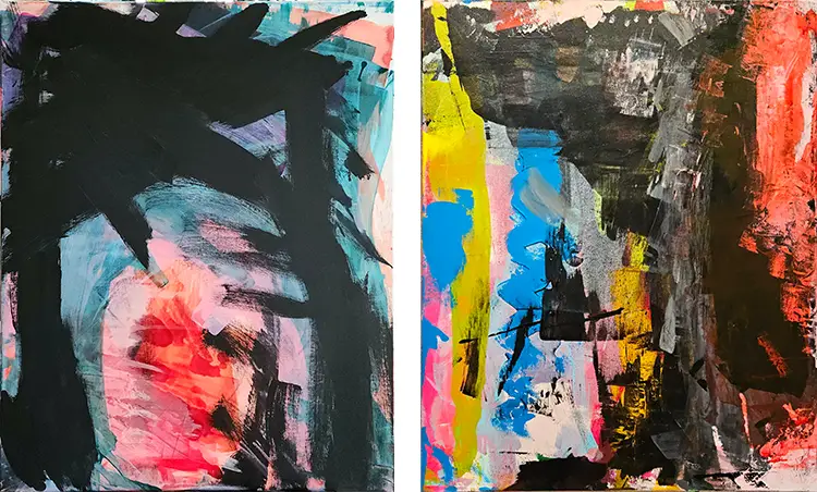 Formally, Roomer’s paintings are built through layering, interruption, and revision, allowing earlier decisions to remain visible beneath later ones. Acrylic fields are overlaid with assertive gestures, scraped areas, and passages of ink that cut through color rather than decorate it. These marks register moments of hesitation and assertion, creating surfaces that record emotional movement over time. Color operates through feeling instead of symbolism, with saturated hues and darker tones coexisting in ways that suggest tension, containment, and release. Rather than resolving these relationships, Roomer allows them to persist, giving the paintings a psychological charge.