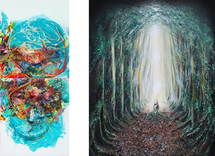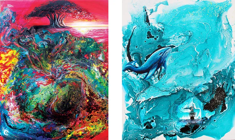 Hillbrand’s artistic style is a harmonious blend of abstraction and realism, with Mother Nature serving as her primary muse. Her work often embodies the four classical elements—Earth, Wind, Fire, and Water—each piece capturing the essence of these natural forces. Through a combination of whimsical brushstrokes and medium mixing, Hillbrand creates visually intriguing landscapes that invite viewers to explore the depths of her imagination. By incorporating diverse materials such as water, resin, ink, and sand – she adds a tactile dimension to her art that brings the natural world into a contemporary context.