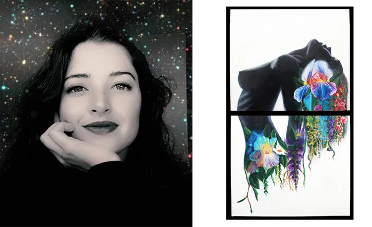 From a young age, Hillbrand was drawn to the world of art, a passion that was reignited during her late teens. She recently found an old sketch of hers, a canoe on a lake. Next to it, a note written in nearly illegible child’s handwriting – “I love art”. It serves as a testament to her early love for creating and expression. Despite a period of self-doubt where she questioned her creative abilities, it was the rediscovery of painting with friends at 19 that rekindled her artistic spirit. This led to the creation of her first significant piece, “Iris: The Goddess of Growth,” a work that took two years to complete and stands as a pivotal moment in her career. This split-canvas masterpiece, characterized by cascading flowers and intricate details, remains Hillbrand’s favorite work to date. Iris is a symbol of her perseverance and artistic vision. Despite receiving numerous offers from collectors, the artist has chosen to keep the original, allowing its prints to resonate with a broader audience.
