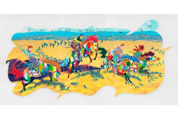 Equally striking is her manipulation of color as a structuring force. Figures are infused with the hues of their environment, blurring distinctions between body and atmosphere. In some works, crimson and violet flesh merges with a surrounding field of blooming forms, suggesting that bodies are porous, constantly transformed by external conditions. In others, figures adopt the coolness of surrounding blues or the radiance of fiery oranges, their identities inseparable from the chromatic stage on which they perform. The palette becomes not a background but a force acting upon the body, reminding us of the artist’s claim that music, wind, or gravity might be the invisible agents shaping these encounters.