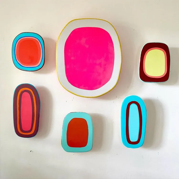 Technically, the creation of these sculptures involves a meticulous process of layering and manipulation. Skantzos uses hand-cut templates to apply shapes and colors, intentionally embracing imperfections to highlight the human touch in her work. The use of neon paints and reflective surfaces adds an extra dimension to the pieces, transforming them into portals of light that captivate and intrigue. This combination of technical skill and creative vision results in works that are both visually compelling and conceptually profound.