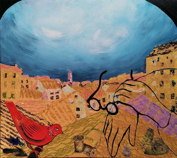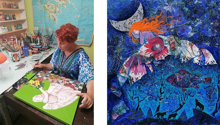 Dimoudi’s work draws from an extensive range of artistic influences, with inspirations that stretch from ancient Greek mosaics to iconic figures in modern art. El Greco, Vincent van Gogh, and Marc Chagall are among her artistic “family,” alongside figures such as Georgia O’Keeffe and Frida Kahlo, who resonate with her through their bold approaches to color, form, and storytelling. She also finds kinship in artists like Hieronymus Bosch, with his fantastical imagery, and Rene Magritte, who brought philosophical undertones to surrealism. This blend of influences weaves together an appreciation for classical beauty with a fascination for the surreal and symbolic.