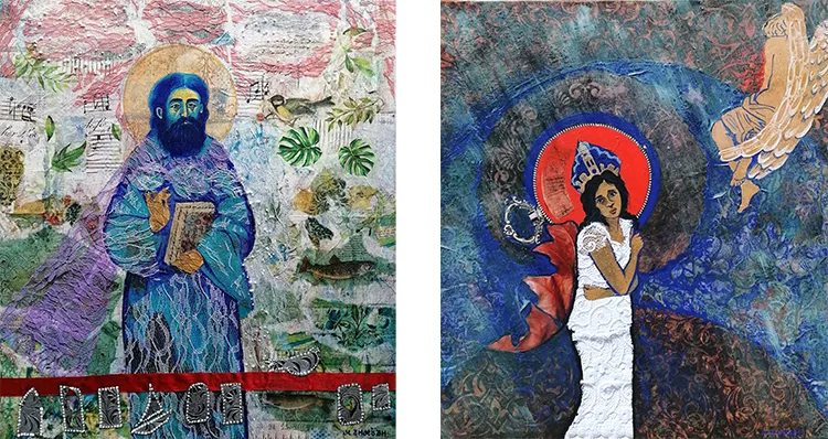 Dimoudi’s creative process unfolds in a studio filled with elements that inspire and sustain her work. Light is essential, as it enhances the vibrancy and depth of her chosen mediums—acrylics, traditional iconography pigments, and upcycled materials that lend texture to her pieces. This combination of media allows her to create works with rich layers, bridging Byzantine techniques with modern, sustainable practices. The materials she selects are carefully chosen for their symbolic and sensory qualities, adding a unique tactile dimension to her art. She incorporates found and recycled objects, creating a blend of old and new, and giving her pieces a sense of history alongside their contemporary relevance.