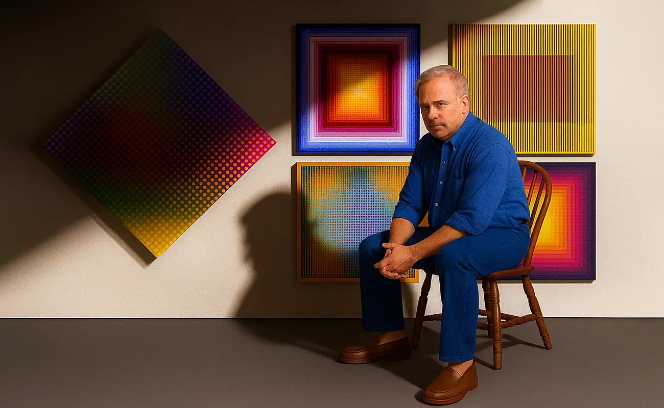 Transitioning from figurative painting to abstract geometry wasn’t merely a stylistic shift; it was a philosophical one. Vogel’s current work falls within the lineage of Op Art, with extensions into Concrete Art, Reductive Art, and Post-Painterly Abstraction. What unites these labels in Vogel’s practice is a desire to strip away narrative and symbolism, leaving only the essential components: shape, line, and color. He builds visual depth not through literal perspective, but through layered hues and rhythmic structures that appear to move or flicker depending on the viewer’s gaze. His art is not passive. It asks the eyes to work.