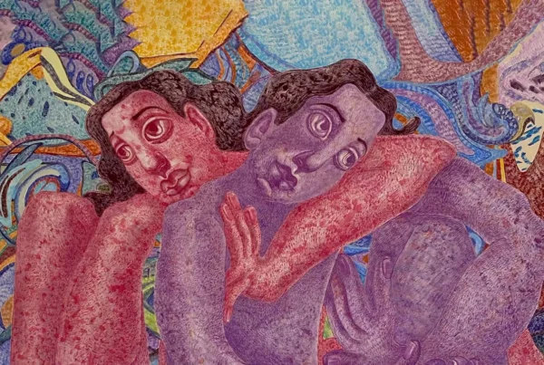 The color palette he employs—especially the persistent recurrence of pinks, greens, and deep blues—suggests an instinctive vocabulary. Pink shifts from playful brightness to unsettling intensity depending on context; green oscillates between grounding earthiness and surreal vibrancy; blue and black punctuate with depth and weight. Rather than following harmony in a conventional sense, these color relationships operate through friction, creating emotional atmospheres that resist easy categorization. The result is a visual experience that feels both familiar and unpredictable.