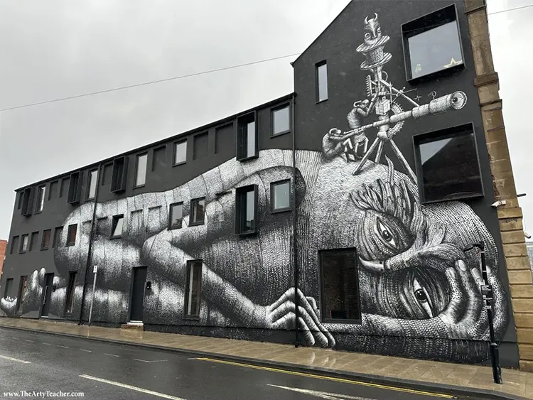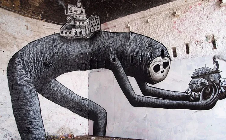 A signature feature of Phlegm’s art is his dedication to monochrome, a choice that strips his murals of color but adds a remarkable focus on line and detail. For Phlegm, the absence of color is not a limitation but a tool that sharpens the viewer’s attention to the intricacies of the piece. Black and white create a stark contrast that enhances the delicate linework he meticulously crafts, encouraging a closer look at the composition. The fine lines, cross-hatching, and textural techniques he employs mimic the old engravings that inspire his work, giving his murals an almost timeless quality. In an age where vibrant color often dominates public art, Phlegm’s monochrome murals stand as quiet yet bold statements that invite contemplation.