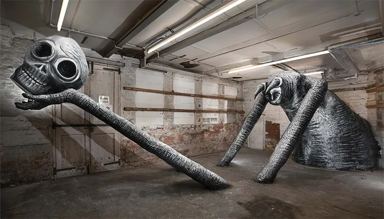 The artist’s sensitivity to place is most evident in his ambitious installation, Mausoleum of the Giants. This project, set in an abandoned industrial space, was a return to Phlegm’s roots, both in terms of location and scale. The giants he created for the installation filled the decaying factory with a sense of grandeur and melancholy, evoking the feeling of entering a forgotten cathedral. The choice of scale was deliberate; by making the giants larger than life, Phlegm aimed to create a sense of awe, much like walking into a vast, sacred space. The installation was a reflection on the passage of time, the power of space, and the smallness of humanity within the grander scheme of things.