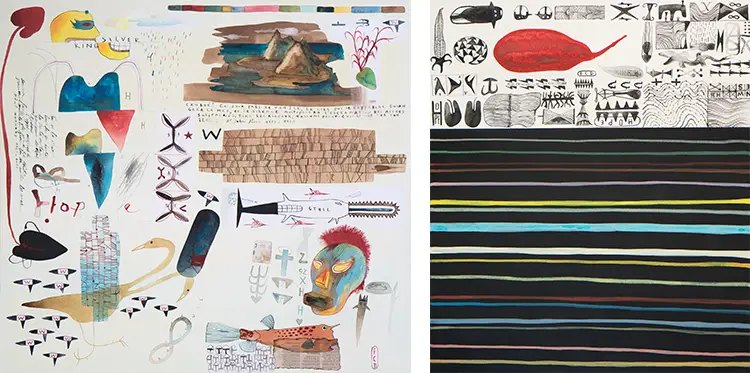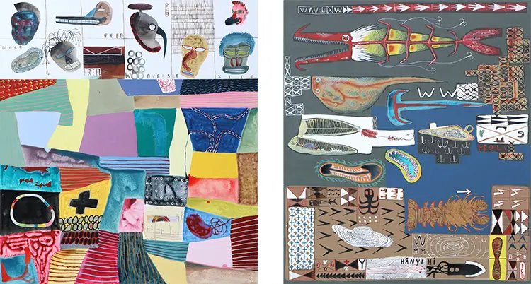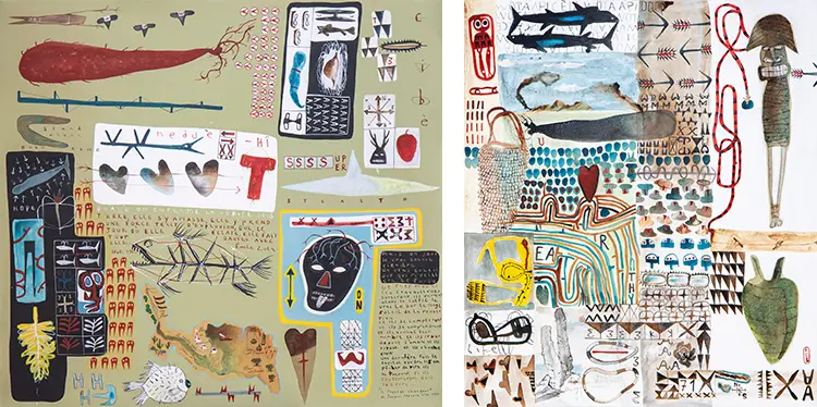 Foucaud’s visual vocabulary is a complex interplay of language, history, and abstraction. His paintings resemble speculative cartographies—dense and symbol-laden spaces where knowledge systems both clash and coalesce. Drawing inspiration from ethnographic sources, outsider art, and the aesthetics of maps, his compositions unravel like visual manuscripts. They do not offer a linear story but rather suggest a field of interpretation, an archive waiting to be read. Masks, animals, anatomical fragments, and geographic symbols sit alongside glyphs, ideograms, French idioms, and English phrases. The resulting works feel like coded transmissions, their meaning elusive but intuitively resonant.