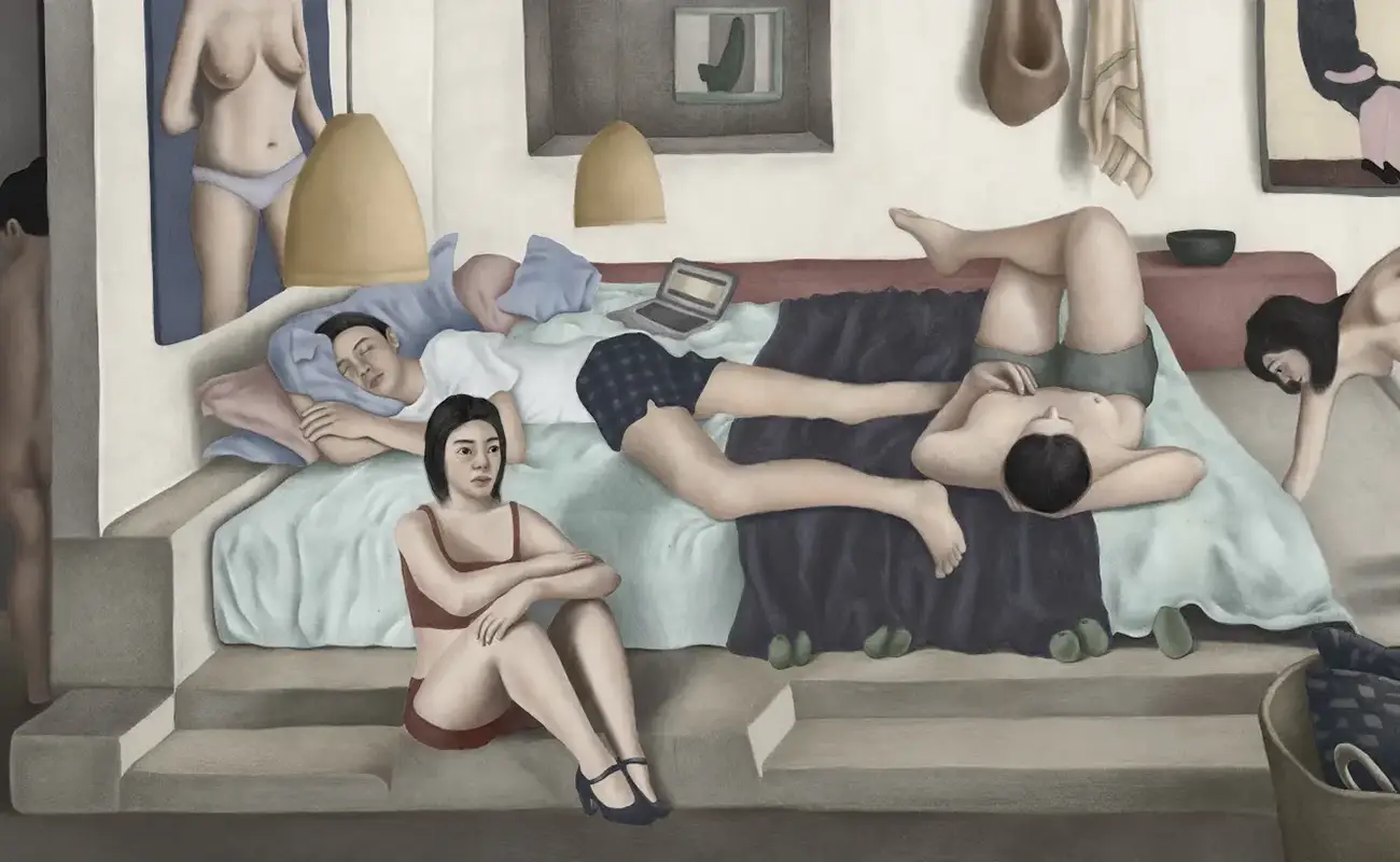 TongTong sees her body of work not as a collection of individual masterpieces, but as an evolving archive—an emotional and perceptual record of her inner movements over time. Instead of anchoring meaning in a single piece, she views her earlier works as reflections of specific moments in her personal development. These pieces, often characterized by cool tones and detached composition, focused on the interplay between human figures and their surrounding spaces. At the time, her work was more observational, held together by a sense of quiet structure and analytical distance.