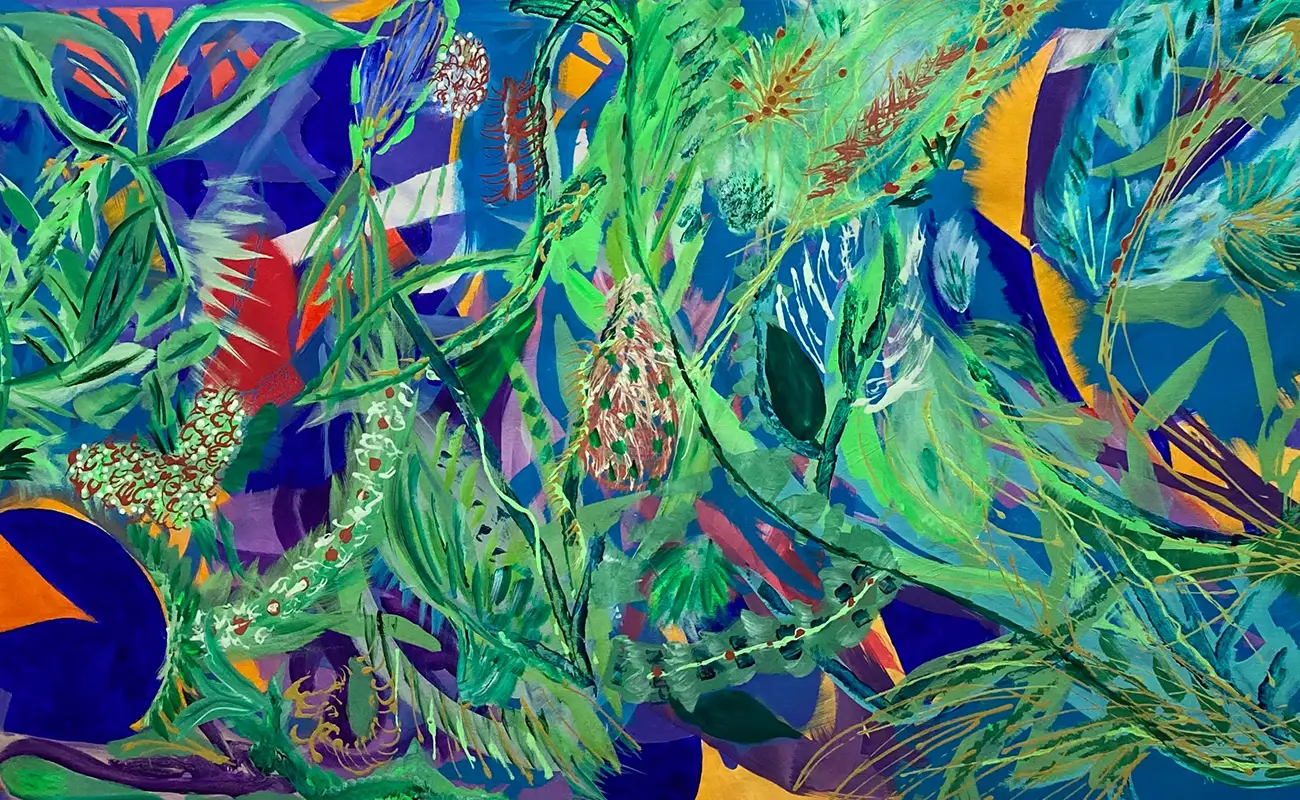 One particularly meaningful work, titled Blue Zone, addresses humanity’s enduring desire for longevity. Scientists have identified specific regions of the world where unusually high numbers of people live beyond one hundred years, calling these areas Blue Zones. In this piece, she questions what might be discovered if we could examine the cellular composition of individuals in such regions. Could genetic engineering replicate those characteristics to create humans with customized life spans? Who would have the authority to make such decisions, and how many would have access to this power? The painting extends beyond biological curiosity to ethical and ecological considerations, asking how nature would respond and how evolution might be altered. Blue Zone embodies her method of merging scientific speculation with philosophical inquiry, encouraging viewers to confront both the promise and the complexity of extending human life.