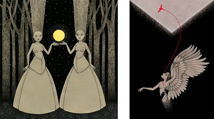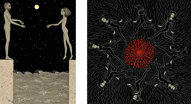 Central to Viive Noor’s artistic ethos are two profound and inescapable forces: love and death. She regards these not as binary opposites, but as intertwined conditions of existence, each shaping the human journey in fundamental ways. Her work often navigates this intersection, portraying the emotional textures of living with an awareness of both connection and impermanence. In this view, illustration is not merely visual decoration but a vehicle for conveying truths that words struggle to articulate. She sees each picture as a mirror—not just of the artist’s intentions but of the viewer’s psyche. Meaning in her work is never fixed; it is fluid, shaped by whoever engages with it and whatever emotions they carry.