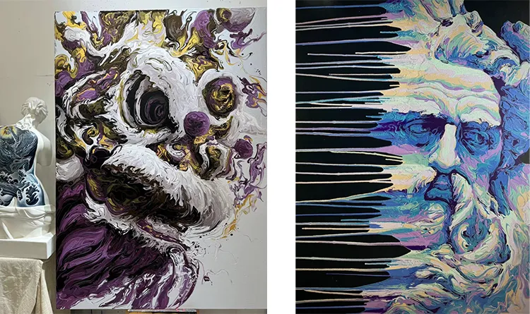 Yifan Zhang’s use of gold streaks has become a signature element in his artwork, symbolizing the divine and the eternal. His process, which involves layering gold paint beneath the surface of the canvas and revealing it through a dramatic unveiling, adds a performative aspect to his work. The gold streaks emerge from the paintings like a revelation, imbuing the figures he depicts—often inspired by classical statues and religious iconography—with a sense of spiritual transcendence. This process mirrors Zhang’s broader artistic mission: to reveal the hidden depths beneath the surface of cultural and historical narratives.
